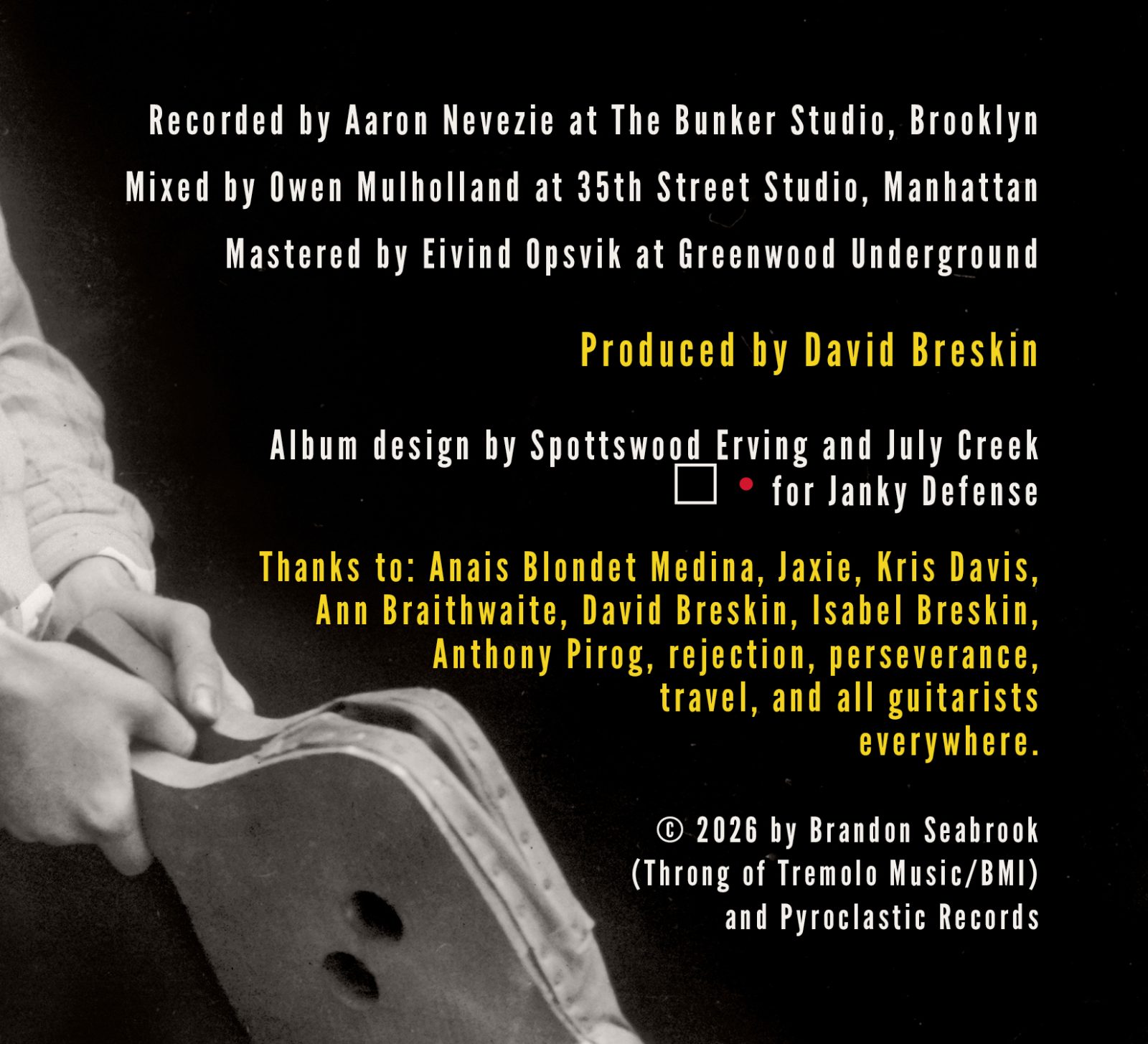 Thanks to: Anais Blondet Medina, Jaxie, Kris Davis, Ann Braithwaite, David Breskin, Isabel Breskin, Anthony Pirog, rejection, perseverance, travel, and all guitarists everywhere.